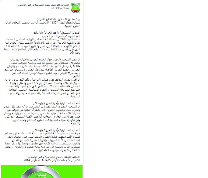 واختتم البيان :" إن الشعب المصري – الذي نحن في القلب من حراكه – ينظر بكل تقدير واحترام لدول وشعوب الخليج ، كان ينتظر أن تعلنوا عن التوقف عن دعم الانقلاب لا اتخاذ قرارات ضد من يدعم شعب مصر وإرادته ويعمل علي حماية أمن الخليج ، ولتعلموا أن مصر الأمنة المستقرة لم تكن ولن تكون إلا عونا لأشقائها فى الخليج فهذا هو واجب الدين والعروبة".