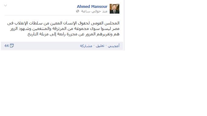 وقال عبر صفحته الرسمية على موقع التواصل الاجتماعي "فيس بوك": "المجلس القومي لحقوق الإنسان المعين من سلطات الإنقلاب فى مصر؛ ليسوا سوى مجموعة من المرتزقة، والمنتفعين، وشهود الزور؛ هم وتقريرهم المزور عن مجزرة رابعة إلى مزبلة التاريخ".