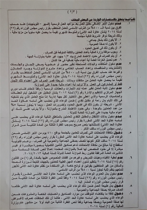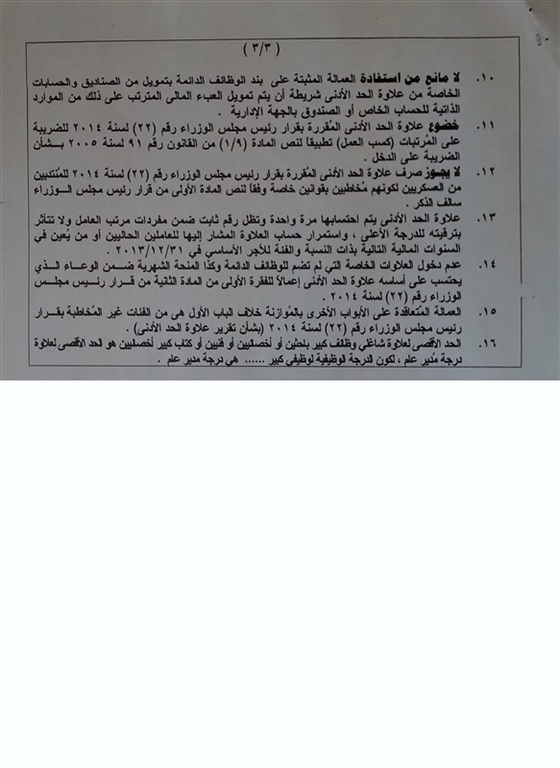 انتهت اللجنة المالية بوزارة المالية  في حكومة الانقلاب الجديدة من إعداد ردود وتوضيحات حول كيفية احتساب علاوة الحد الأدنى للأجور، وذلك بعد ورود العديد من التساؤلات، والاستفسارات من بعض الجهات الإدارية بالدولة عن كيفية التعامل مع بعض الأنواع، والبدلات، والمكافآت؛ المقررة لبعض العاملين لدى احتساب علاوة الحد الأدنى للأجور، والتي تصرف للعاملين المدنيين بالدولة بموجب قرار رئيس مجلس الوزراء في حكومة الانقلاب المستقيلة رقم 22 لسنة 2014 ، وفي ضوء المنشور العام رقم 1 لسنة 2014 الصادر عن وزارة المالية في هذا الشأن، والتي من المقرر صرفها نهاية مارس لبعض الجهات الإدارية بالدولة وأخرى تم تأجيل صرفها له، موضحة أسباب التأجيل – بحسب "بوابة الأهرام".