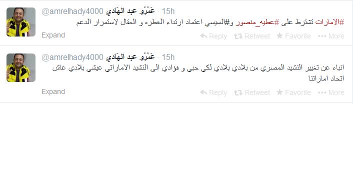 وقال عبد الهادى عبر حسابه الشخصى على موقع التواصل الإجتماعى " تويتر" :" انباء عن تغيير النشيد المصري من بلادي بلادي لكي حبي و فؤادي الى النشيد اﻻماراتي عيشي بلادي عاش اتحاد اماراتنا".