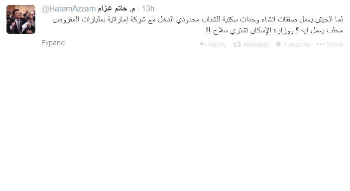 وقال عبر حسابه الشخصى على موقع التواصل الاجتماعى "تويتر" : "لما الجيش يعمل صفقات انشاء وحدات سكنية للشباب محدودي الدخل مع شركة إماراتية بمليارات المفروض محلب يعمل إيه ؟ ووزارة الإسكان تشتري سلاح !!".