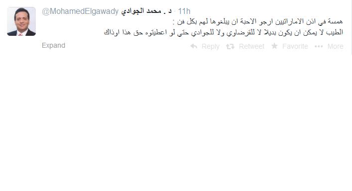 وقال عبر حسابه الرسمي على موقع التواصل الاجتماعى "تويتر" :"همسة في أذن الإماراتيين أرجو الأحبة أن يبلغوها لهم بكل فن: الطيب لا يمكن أن يكون بديلا لا للقرضاوي ولا للجوادي حتي لو أعطيتوه حق هذا أو ذاك".