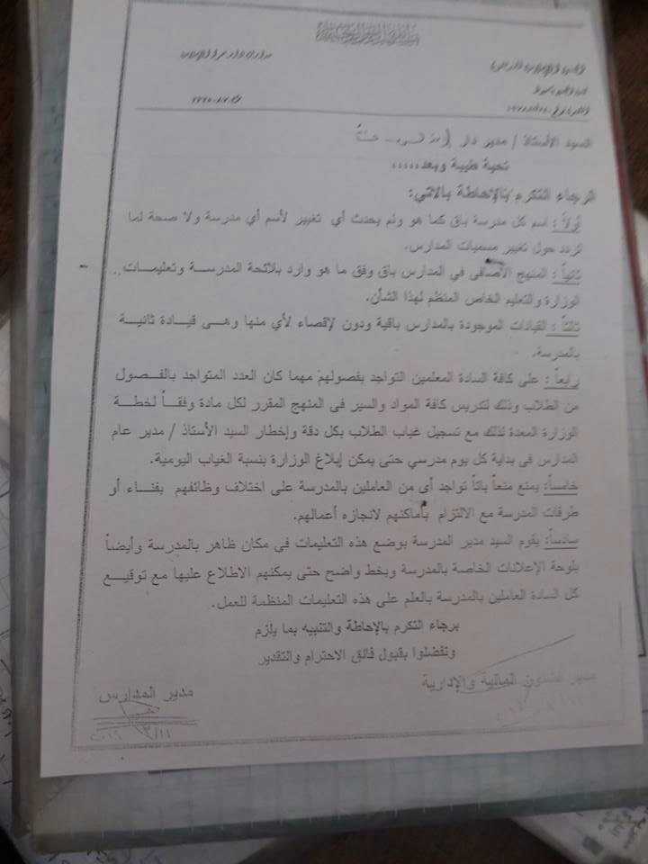 بينما جاء في البند الثالث عدم وجود إقصاء للقيادة السابقة – التي تُعد القيادة الشرعية للمدرسة – و إعتبارها قيادة ثانية بعد القيادة الجديدة و المُعينة بأمر من حكومة الانقلاب ، فيما لم يتم توضيح ما دور القيادة الشرعية في إدارة المدارس ، حيث  إحتمالية إعتبارها قيادة إشرفية أمر وارد حينما يتم التنفيذ على أرض الواقع  .