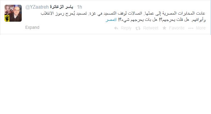 أكد ياسر الزعاترة – الكاتب والمحلل السياسى – أن المخابرات المصرية عادت إلى عملها من جديد ، وتجرى اتصالات لوقف التصعيد فى غزة والذى يحرج رموز الانقلاب.