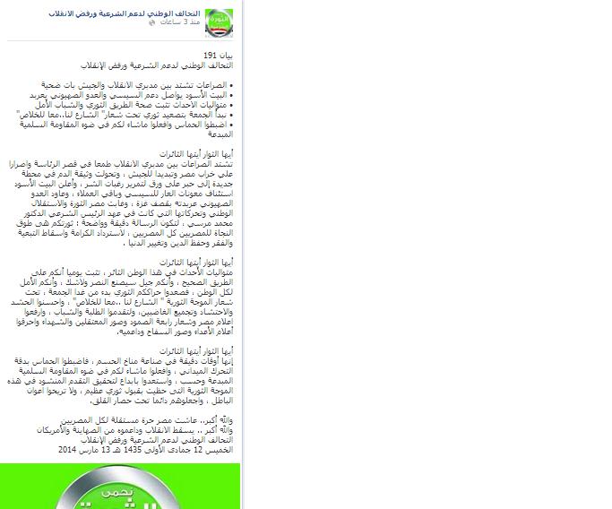 وذكر البيان أن: "الصراعات تشتد بين مدبري الانقلاب طمعا في قصر الرئاسة واصرارا علي خراب مصر وتبديدا للجيش، وتحولت وثيقة الدم في محطة جديدة إلى حبر على ورق لتمرير رغبات الشر، وأعلن البيت الأسود استئناف معونات العار للسيسي وباقي العملاء، وعاود العدو الصهيوني عربدته بقصف غزة، وغابت مصر الثورة والاستقلال الوطني وتحركاتها التي كانت في عهد الرئيس الشرعي الدكتور محمد مرسي، لتكون الرسالة دقيقة وواضحة: ثورتكم هى طوق النجاة للمصريين كل المصريين، لاسترداد الكرامة واسقاط التبعية والفقر وحفظ الدين وتغيير الدنيا".