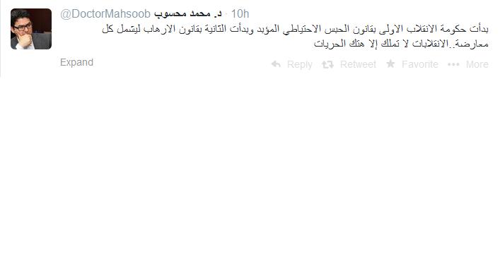 وأضاف محسوب عبر حسابه الشخصى على موقع التواصل الاجتماعي "تويتر" : "بدأت حكومة الانقلاب الاولى بقانون الحبس الاحتياطي المؤبد وبدأت الثانية بقانون الإرهاب ليشمل كل معارضة.. الانقلابات لا تملك إلا هتك الحريات".