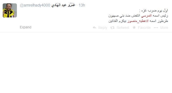 وقال عبر صفحته الرسمية على موقع التواصل الاجتماعي "تويتر" : " أول يوم ضرب غزة : رئيس اسمه مرسي انتفض ضد بني صهيون، طرطور اسمه عطيه منصور بيكرم الفنانين".