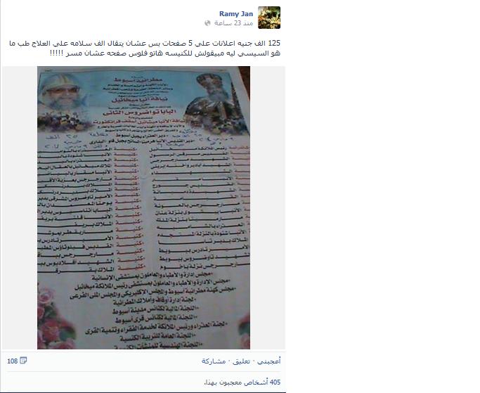وقال عبر حسابه الرسمي على موقع التواصل الاجتماعي "فيس بوك": "125 ألف جنيه إعلانات على 5 صفحات بس عشان يتقال ألف سلامة على العلاج طب ما هو السيسي ليه مبيقولش للكنيسة هاتوا فلوس صفحة عشان مسر !!!!! ".
