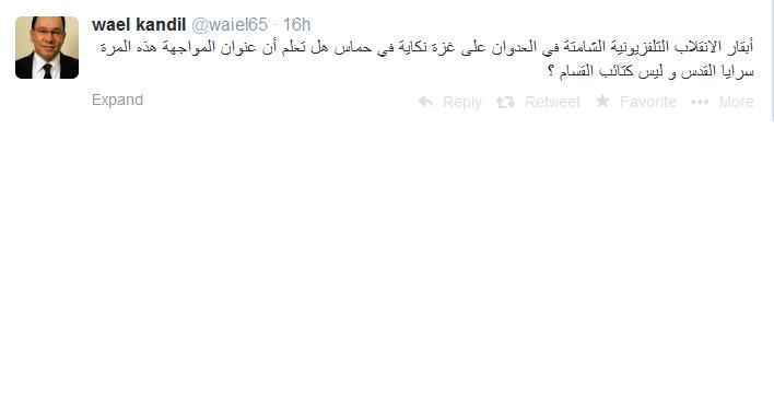 وقال عبر حسابه الشخصي على موقع التواصل الاجتماعي "تويتر" :" أبقار الانقلاب التلفزيونية الشامتة في العدوان على غزة نكاية في حماس هل تعلم أن عنوان المواجهة هذه المرة سرايا القدس و ليس كتائب القسام ؟".