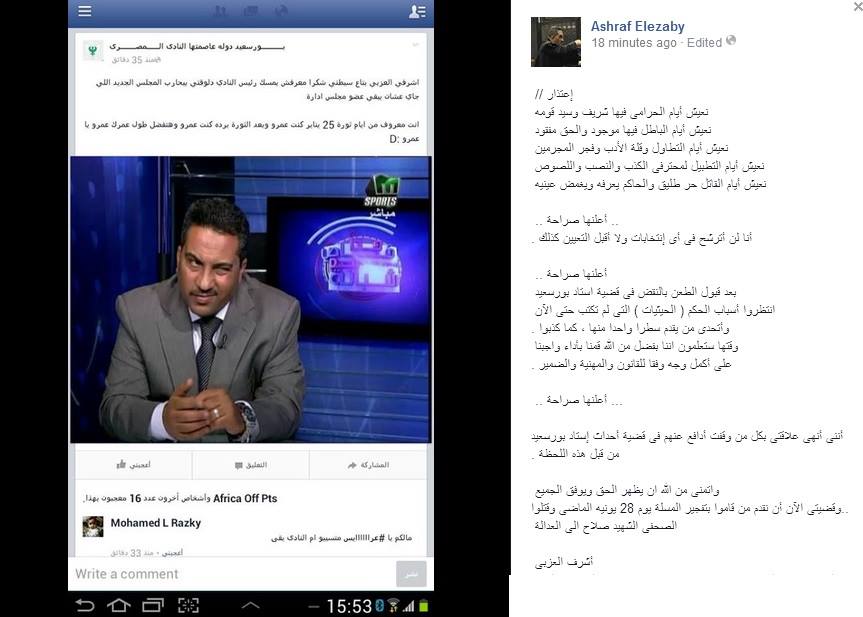 حيث قال العزبي عبر صفحته الرسمية على موقع التواصل الإجتماعي (( الفيس بوك )) أنه يعلنها صراحه "أننى أنهى علاقتى بكل من وقفت أدافع عنهم فى قضية أحداث استاد بورسعيد من قبل هذه اللحظة وقضيتى الآن أن نقدم من قاموا بتفجير المسلة يوم 28 يونيه الماضى وقتلوا الصحفي الشهيد صلاح الى العدالة "