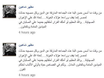 وقال شاهين، على حسابة الرسمي" فيس بوك""لعنة الله على الإخوان الصهاينة… والله العظيم لو أملك القرار لعلقتهم جميعًا على الصلبان في الميادين العامة وبالقانون العادل… ولكم في القصاص حياة يا أولى الألباب لعلكم تتقون".