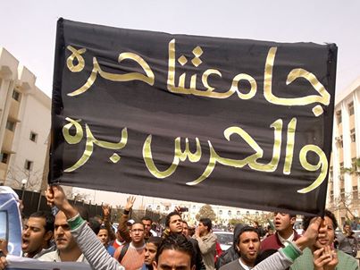 نظم طلاب جامعة الأزهر بالقاهرة مظاهرات حاشدة – اليوم الأحد – داخل حرم الجامعة رفضًا للانقلاب العسكرى، وللمطالبة بالافراج عن المعتقلين واحتجاجًا على عودة الحرس الجامعي.