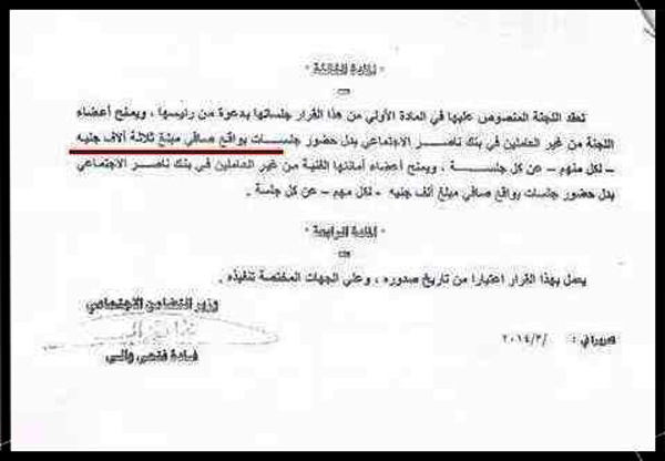 وعرضت النقابة العامة للأطباء – اليوم الأحد –  بحسب ما أوردته "بوابة الأهرام" صورة من نموذج خاص بوزارة التضامن الاجتماعي، موقع من الوزيرة الدكتورة غادة والي، وينص على منح أعضاء اللجنة الخاصة ببنك ناصر الاجتماعى والأعضاء غير عاملين به 3 آلاف جنيه بدل حضور عن كل جلسة.