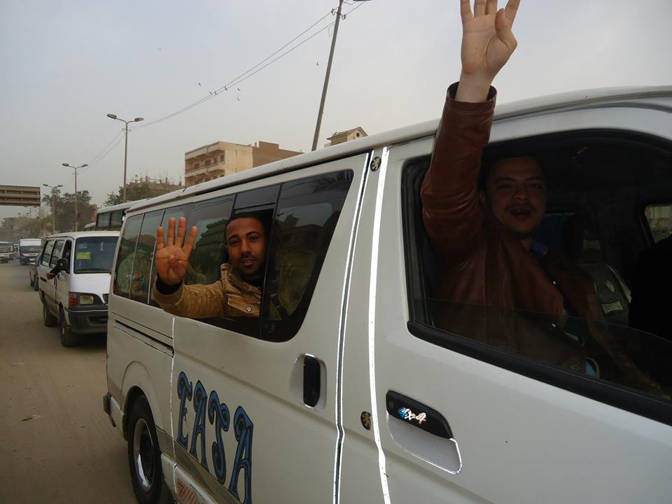 ورفع المشاركون شارات رابعة العدوية، وصورا للرئيس محمد مرسي، ولافتات تندد بسوء الأحوال الاقتصادية وتدني الأوضاع المعيشية والخدمات، وأخرى ولافتات تطالب بإنهاء حكم العسكر، وممارسات الداخلية بحق الشعب المصري.