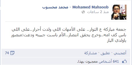 وقال محسوب عبر صفحته الشخصية على " فيس بوك ": " جمعة مباركة ع الثوار.. على الأمهات اللي ولدت أحرار..على اللي باس كف أمه..وخرج يحقق انتصار..الأم باست جبينه ودعت:منصور يا ولدي البار".