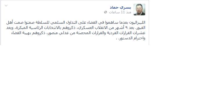 وقال حماد عبر حسابه الشخصى على موقع التواصل الاجتماعي "فيس بوك" : "الليبراليون بعدما ساهموا في القضاء على التداول السلمي للسلطة صمتوا صمت أهل القبور. بعد ٩ أشهر من الانقلاب العسكري، ذكروهم بالانتخابات الرئاسية المبكرة، وبعد عشرات القرارات الفردية والقرارات المحصنة من عدلي منصور، ذكروهم بهيبة القضاء واحترام الدستور".