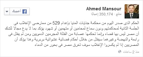 قال الإعلامى أحمد منصور تعليقا على إحالة أوراق 529 من رافضى الانقلاب إلى المفتى بمحافظة المنيا "أن الحكم الذى صدر اليوم من محكمة جنايات المنيا بإعدام 529 من معارضى الإنقلاب فى الجلسة الثانية لمحاكمتهم ودون سماع لمحامين أو متهمين أو شهود يؤكد بما لا يدع مجالا للشك أن مصر ليس بها قضاء وإنما تحكمها عصابة من القتلة المجرمين الدمويين ".