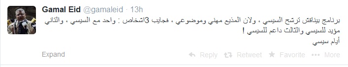 وقال عيد عبر حسابه الشخصى على موقع التواصل الاجتماعي " تويتر" :" برنامج بيناقش ترشح السيسي ، ولان المذيع مهني وموضوعي ، فجايب 3اشخاص : واحد مع السيسي ، والتاني مؤيد للسيسي والثالث داعم للسيسي ! أيام سيسي".