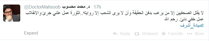 وقال محسوب عبر حسابه الشخصى على موقع التواصل الاجتماعى "تويتر" :" لا يقتل الصحفيين إلا من يرغب بدفن الحقيقة وأن لا يرى الشعب إلا روايته .. الثورة عمل علني جرئ والانقلاب عمل خفي دنئ. رحم الله ميادة أشرف".
