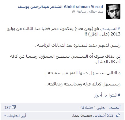 وقال عبر صفحته الشخصية على موقع التواصل الاجتماعى "فيس بوك" :"السيسي هو (ومن معه) يحكمون مصر فعليا منذ الثالث من يوليو 2013 (على الأقل) !!  وليس لديهم جديد ليضيفوه بعد انتخابات الرئاسة ..