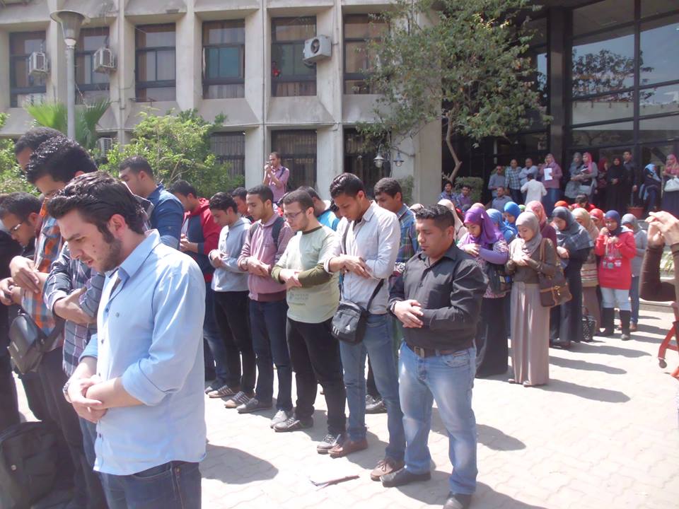 وأدى الطلاب صلاة الجنازة على شهيدة كلية الإعلام بالجامعة الزميلة ميادة ، والتي قتلت على يد قوات أمن الانقلاب الجمعة الماضية . كما قام الطلاب اليوم بالخروج من أمام باب مترو الجامعة وإحداث شلل مرورى .