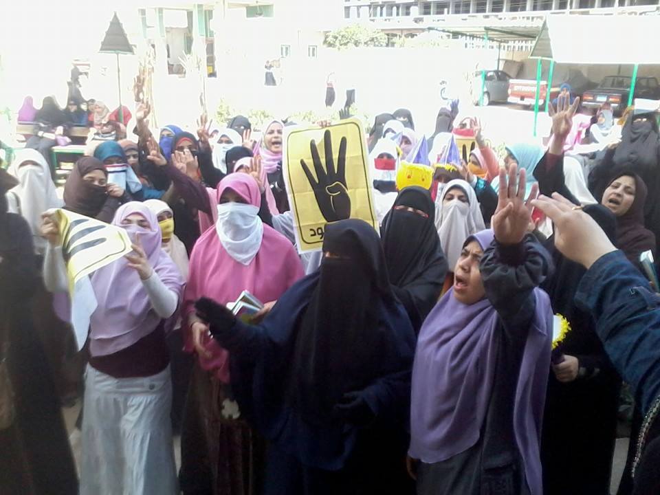 نظمت طالبات كلية الدراسات الإسلامية – فرع جامعة الأزهر_بكفر الشيخ وقفة احتجاجية داخل حرم الكلية بـ "الطراطير" للتنديد بجرائم العسكر وترشح قائد الانقلاب العسكري لرئاسة الجمهورية.