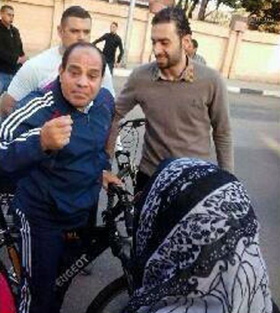 تداول مجموعة من النشطاء على مواقع التواصل الإجتماعي صور قائد الانقلاب العسكري " عبدالفتاح للسيسى" بالزى الرياضى ، وهو يركب "عجلة" ، ويخاطب مجموعة من المارة.