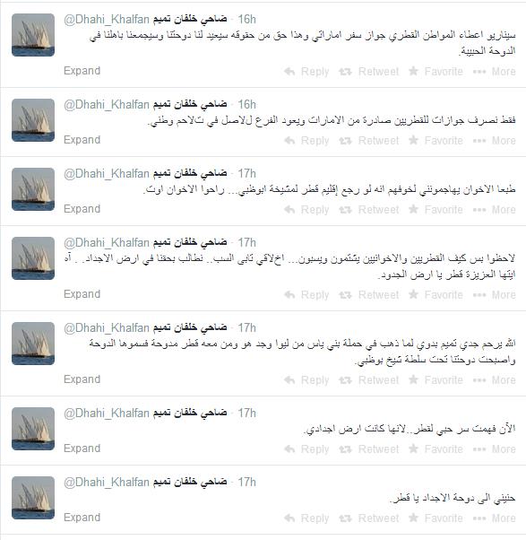 وأضاف:"قطر جزء ﻻ يتجزأ من اﻻمارات 80% من قطر أسر إماراتية، شعب قطر شعب إماراتي أصلا نحن وشعب قطر شعب واحد… حسبي الله على اﻻستعمار فرقنا. قطر تابعة لمشيخة ابوظبي من زمان، المفروض نضع على حدودنا باتجاه قطر انتم اﻵن على مشارف اﻻمارة الثامنة لدولة الإمارات العربية المتحدة".