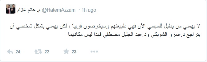 وقال عزام عبر حسابه الشخصى على موقع التواصل الاجتماعي "تويتر" :" لا يهمني من يطبل للسيسي الآن فهي طبيعتهم وسيخرصون قريباً ، لكن يهمني بشكل شخصي أن يتراجع د.عمرو الشوبكي ود.عبد الجليل مصطفي فهذا ليس مكانهما".