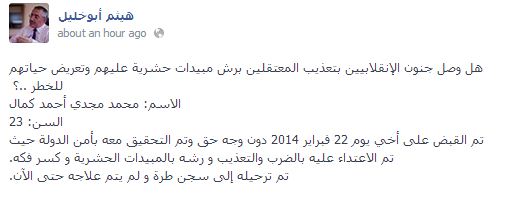 حيث ذكر أبو خليل عبر صفحته الرسمية على موقع التواصل الاجتماعي فيس بوك ، رسالة وردته من شقيق أحد المعتقلين – نصها: