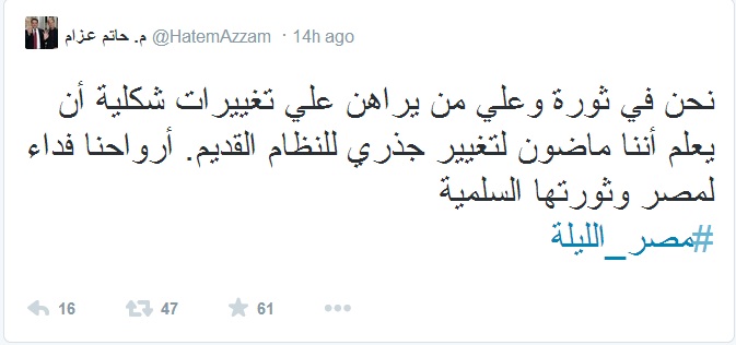 وقال عبر حسابه الشخصى على موقع التواصل الاجتماعى "تويتر" :" نحن في ثورة وعلي من يراهن علي تغييرات شكلية أن يعلم أننا ماضون لتغيير جذري للنظام القديم ، أرواحنا فداء لمصر وثورتها السلمية".