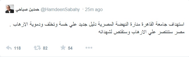 علق حمدين صباحى – زعيم التيار الشعبى والمرشح المحتمل لرئاسة الجمهورية – على التفجيرات التى حدثت أمام جامعة القاهرة – اليوم الأربعاء – وأكد أنها دليل على خسة وتخلف الإرهاب.