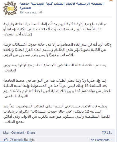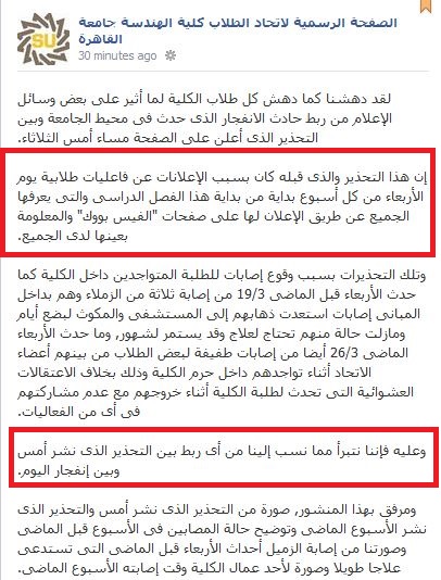 أكد اتحاد طلاب كلية هندسة في بيان منذ قليل، أن ما نشر بوسائل الإعلام حول تحذيرهم أمس، هو تحذير من الاقتراب من التظاهرات والاشتباكات التي تحدث أسبوعياً، وهذا التحذير حدث من قبل  وليس كما زعم البعض أنه تحذير من تفجيرات اليوم، مؤكدين انهم نشروا التحذير بعد التحدث مع ادارة الكلية حرصًا على عدم تكرار اصابات الطلاب بسبب الاشتباكات.