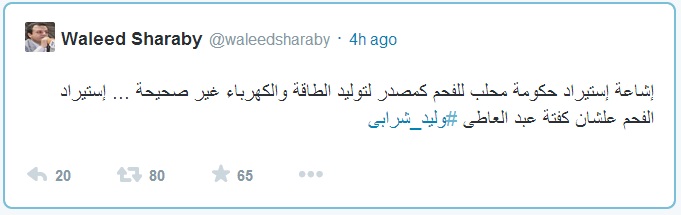 وقال عبر حسابه الرسمي على موقع التواصل الاجتماعي "تويتر" : "إشاعة استيراد حكومة محلب للفحم كمصدر لتوليد الطاقة والكهرباء غير صحيحة … استيراد الفحم علشان كفتة عبد العاطي".