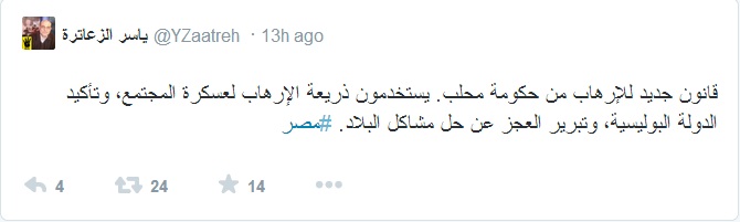 وقال عبر حسابه الرسمي على موقع التواصل الاجتماعي " تويتر" : " قانون جديد للإرهاب من حكومة محلب. يستخدمون ذريعة الإرهاب لعسكرة المجتمع، وتأكيد الدولة البوليسية، وتبرير العجز عن حل مشاكل البلاد."