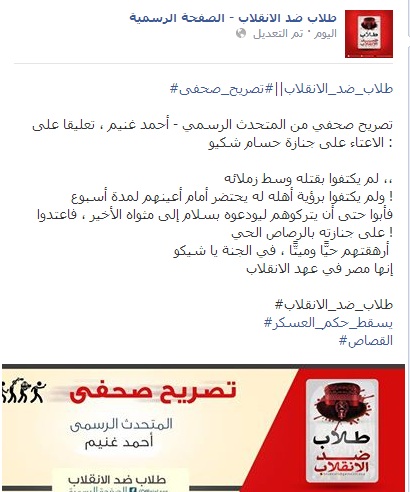 نشرت الصفحة الرسمية لطلاب ضد الانقلاب تصريح صحفي من المتحدث الرسمي باسم الحركة " أحمد غنيم"، تعليقًا على الاعتداء على جنازة "حسام شكيو" شهيد جامعة القاهرة.