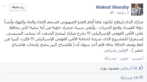 وقال عبر صفحته الشخصية على موقع التواصل الاجتماعى "فيس بوك" :" مبارك الذى انبطح ثلاثون عامًا أمام العدو الصهيونى فسمم الغذاء والماء والهواء وأنشأ دولة الفساد وقمع الحريات ، وأبقى سيناء صحراء خاوية من أية تنمية لكى يحافظ على الأمن القومى الإسرائيلى !!! يخرج مبارك لينصح الشعب أن ينتخب السيسى استمرارًا للمشروع الذى شيده لحماية الأمن القومى الإسرائيلى !!! فكرت كثيرًا عن لفظ يوصف الحالة بدقه فلم أجد سوى أن (هاشتاج كبير ينصح بانتخاب هاشتاج صغير).