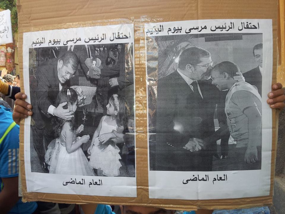 جدير بالذكر أن عدد من المتظاهرين رفعو لافتات إعتذار ليتامى القرية من الأطفال الذين تعودوا على تكريمهم فى هذا اليوم سنويا ، ولكن جاء هذا العام ليتفاجئوا بإيقاف أنشطة الجمعيات التى كانت تقوم على الاحتفال بهم فى اليوم العالمي لليتيم .