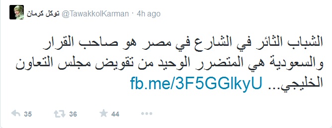 وقالت عبر حسابها الرسمى على موقع التواصل الاجتماعي "تويتر" :" الشباب الثائر في الشارع في مصر هو صاحب القرار والسعودية هي المتضرر الوحيد من تقويض مجلس التعاون الخليجي".