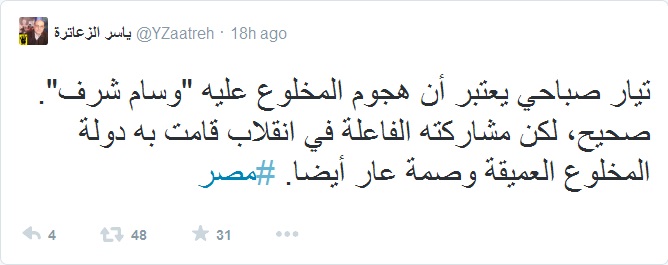 وقال الزعاترة عبر حسابه الشخصى على موقع التواصل الاجتماعي " تويتر" :" تيار صباحي يعتبر أن هجوم المخلوع عليه "وسام شرف". صحيح، لكن مشاركته الفاعلة في انقلاب قامت به دولة المخلوع العميقة وصمة عار أيضا".
