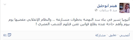 وقال عبر حسابه الشخصي على موقع التواصل الاجتماعى "فيس بوك": "أثيوبيا تسير في بناء سد النهضة بخطوات متسارعة.. والنظام الإنقلابي مقضيها يوم بيوم وأهم حاجة عنده يطلع قوانين تقنن قتله للشعب المصري!".