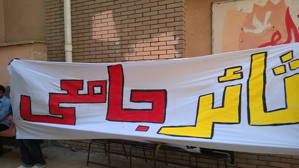 ورفع الطلاب المشاركون شارات رابعة العدوية ولافتات تندد بحكم العسكر ومع الصورة "ثائر جامعي"، واختتمت الفاعليه بترديد الهاشتاج المسيء للسيسي قائد الانقلاب العسكري.