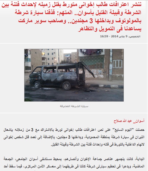 عرض الصحفي عبد الرحيم علي خلال برنامجه الصندوق الأسود فيديو قديم للمعتقل إبراهيم ثابت حسين طالب بالمدرسة الثانوية الصناعية الذي قامت قوات أمن الانقلاب باعتقاله يوم 7 يناير 2014 ، وهو موجود الآن بسجن قنا العمومي في زنزانة 15 ، فى محاولة منه لإلصاق تهمة إشعال الفتنة بين قبائل أسوان بجماعة الإخوان المسلمين، فيما قام موقع "اليوم السابع" بنشر تفاصيل هذه الاعترافات في يوم 9 يناير 2014 منذ أربعة أشهر.