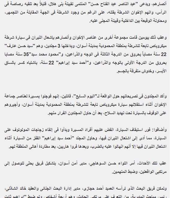وزعم على خلال برنامجه أنه حديث وهو سبب الاشتباكات التى حدثت فى أسوان بين قبيلتي بني هلال والدابودية لتوريط جماعة الإخوان في قضية ليس لهم دخل بها وإيهام الرأي العام ان الاشتباكات الدامية التي تمت في اسوان كانت بترتيب من الإخوان.