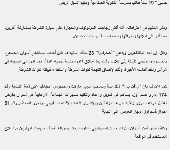 فيما تقدم أهالي الطالب المعتقل إبراهيم ثابت بطلب للمحامي العام لنيابات أسوان منذ فترة طويلة لإعادة التحقيق معه لأن الأقوال الموجودة في محضر النيابة تمت تحت ضغط مباحث أسوان.