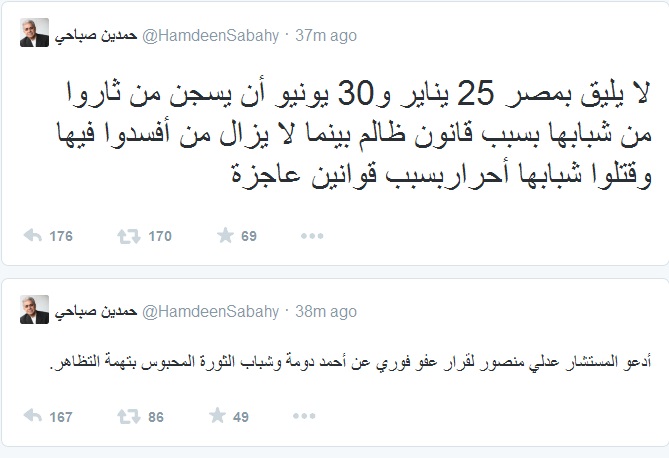 طالب حمدين صباحى – المرشح المحتمل للرئاسة – "المعين" عدلى منصور بإصدار قرار عفو فوري عن أحمد دومة والمحبوسين بتهمة التظاهر.