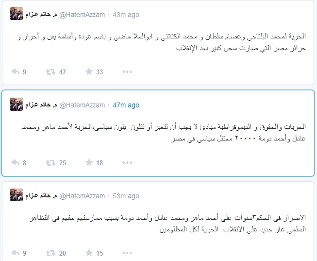 وأضاف :" الحريات والحقوق و الديموقراطية مبادئ لا يجب أن تتغير أو تتلون بلون سياسي،الحرية لأحمد ماهر ومحمد عادل وأحمد دومة ٢٠٠٠٠ معتقل سياسي في مصر، الحرية لمحمد البلتاجي وعصام سلطان ومحمد الكتاتني وابوالعلا ماضي وباسم عودة وأسامة يس و أحرار و حرائر مصر التي صارت سجنا كبيرا بعد الانقلاب".