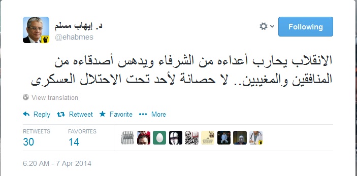 وقال مسلم عبر حسابه الشخصى على موقع التواصل الاجتماعي "تويتر":" الانقلاب يحارب أعداءه من الشرفاء ويدهس أصدقاءه من المنافقين والمغيبين.. لا حصانة لأحد تحت الاحتلال العسكرى".