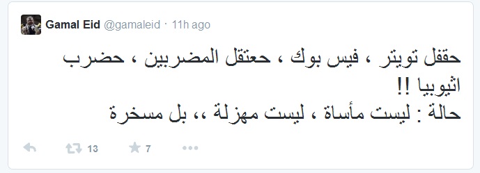 وقال عبر حسابه الشخصى على مووقع التواصل الاجتماعى "فيس بوك" : " حقفل تويتر ، فيس بوك ، حعتقل المضربين ، حضرب اثيوبيا !! حالة : ليست مأساة ، ليست مهزلة ،، بل مسخرة".