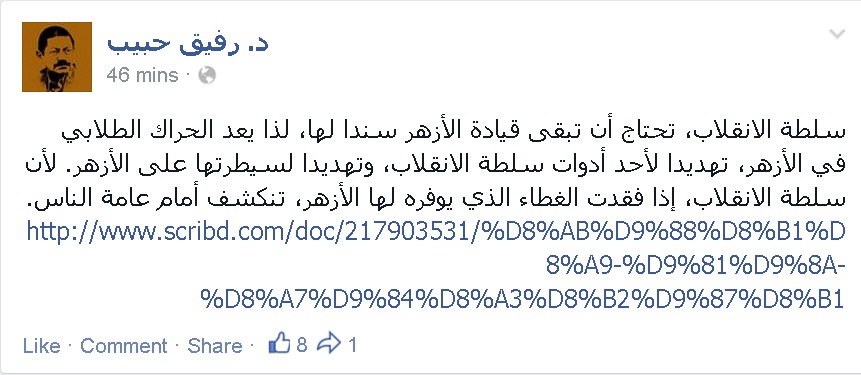 وأضاف حبيب في تدوينة له عبر صفحته على فيس بوك :"سلطة الانقلاب، تحتاج أن تبقى قيادة الأزهر سندا لها، لذا يعد الحراك الطلابي في الأزهر، تهديدا لأحد أدوات سلطة الانقلاب، وتهديدا لسيطرتها على الأزهر. لأن سلطة الانقلاب، إذا فقدت الغطاء الذي يوفره لها الأزهر، تنكشف أمام عامة الناس".